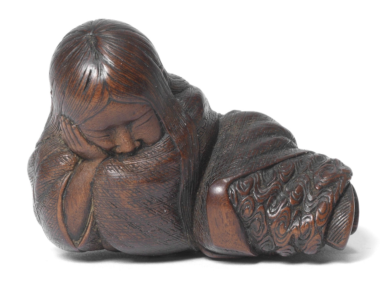 Lying aleeep, her head resting on her right hand and her long hair trailing over her robe which is carved and engraved with diaper and swirling cloud designs; signed with ukibori characters in a rectangular reserve Tadatoshi.