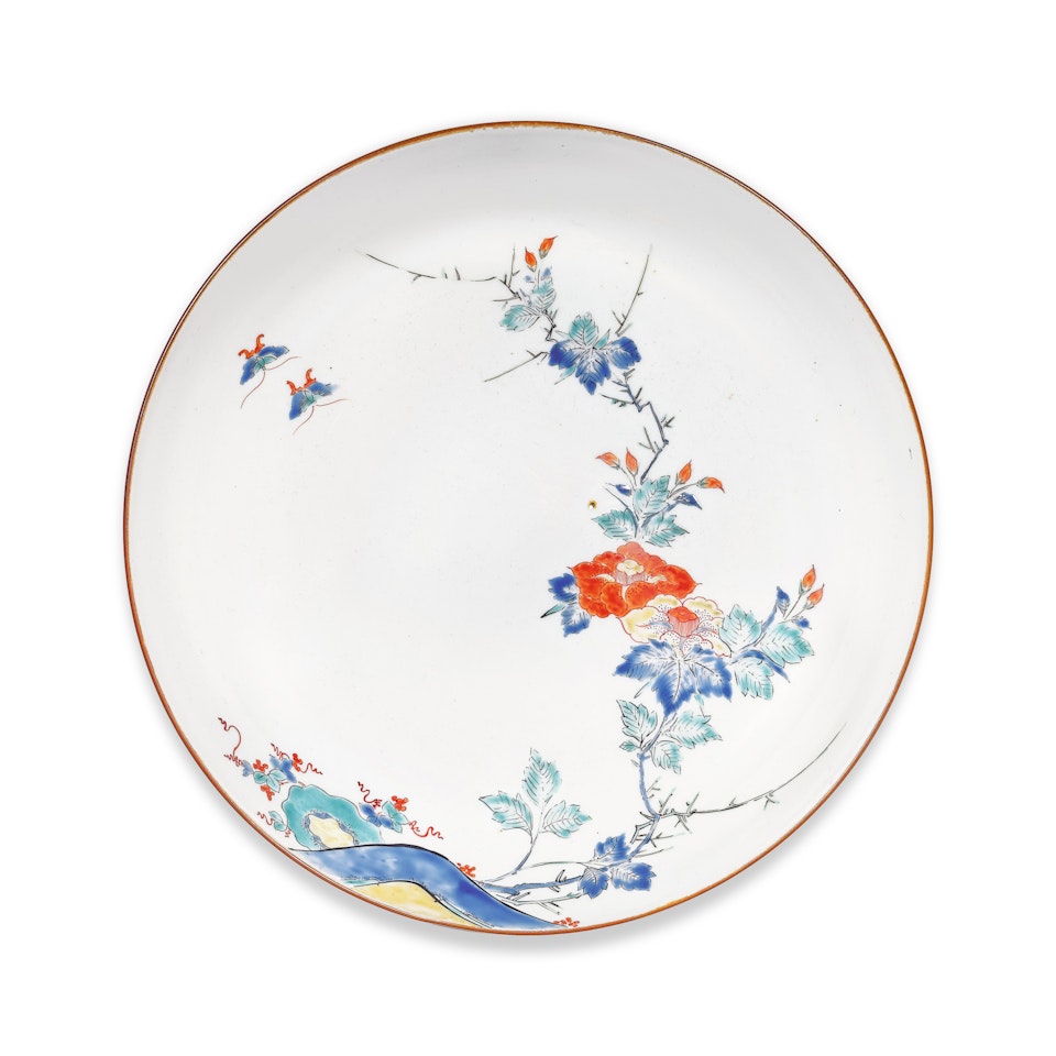 the shallow, circular dish decorated in iron-red, green, yellow, blue and black enamels with butterflies hovering beside tree peonies emerging from behind rockwork, chocolate rim