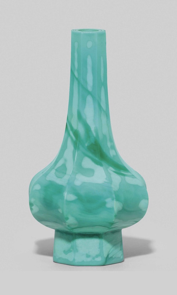 The vase is raised on a high octagonal foot supporting a slightly compressed body and tall neck of conforming shape. It is of a mottled greenish-blue colour.