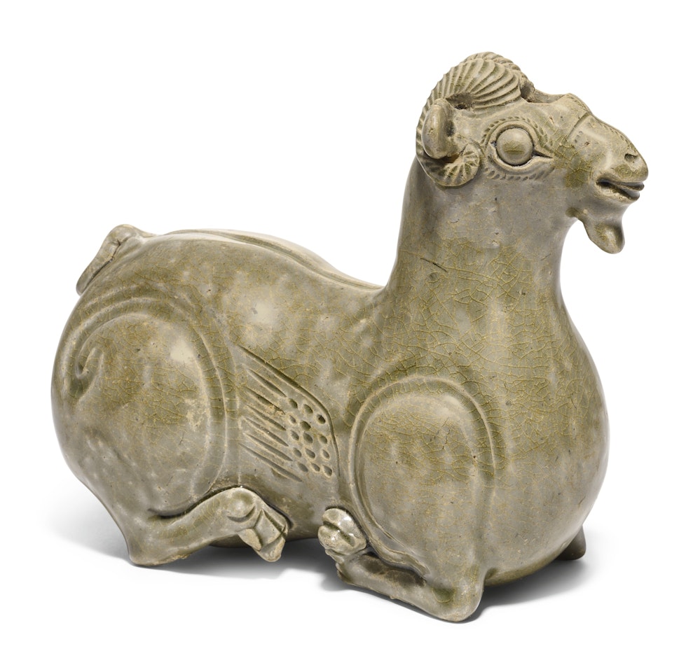 A 'YUE' CELADON-GLAZED RAM by Anonymous